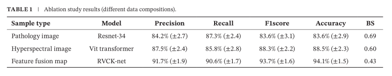为验证多模态融合(病理 + 高光谱)在膀胱癌分级诊断中的有效性,作者设计了对照实验:先分别单独使用病理图像与高光谱图像进行特征提取与分类,以评估各模态的独立贡献;随后采用 RVCK-net 融合两类特征,验证多模态协同带来的性能增益。具体结果见表1。具体来说,病理图像模型取得了83.6%的准确率(±2.9%),Brier评分为0.69,而高光谱图像模型的精度达到88.5%(±2.3%),Brier评分降低0.60。这表明高光谱成像在捕获组织光谱细节方面的优势,使膀胱癌的诊断更加**。然而,无论是病理图像还是高光谱图像,单模态特征在准确性和鲁棒性方面都存在局限性,尤其是病理图像模型在处理数据复杂度和光谱信息方面存在局限性,而高光谱图像模型虽然能够捕捉到丰富的光谱信息,但缺乏详细的空间结构信息。