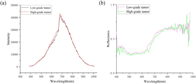 图4 展示了不同分级膀胱癌肿瘤样本经高光谱成像获取的光谱特征。(a) 为低级别与**别肿瘤的光谱强度曲线,(b) 为对应的反射率光谱曲线。两图直观呈现了不同分级肿瘤在光谱维度上的差异,为模型后续分类与分级提供了关键的光谱依据。