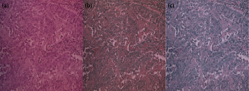 为确保高光谱成像(HSI)在膀胱癌分级中的准确性与可靠性,设计了多步预处理流程。图3 展示了从原始数据到*终去噪结果的演变,并量化各步骤对图像质量的提升效果。图3a:原始图像受噪声与照明不均影响,癌与正常组织难以区分。图3b:经反射率校正后,照明均匀性显著改善,平均信噪比(SNR)提升 21.3%,系统照明伪影被有效抑制,光谱可比性增强。图3c:进一步采用小波多尺度去噪,在保留关键光谱-空间信息的同时抑制高频噪声;峰值信噪比(PSNR)再增 3.7 dB,背景方差降低 28.6%,充分保留诊断结构并减少无关变异。